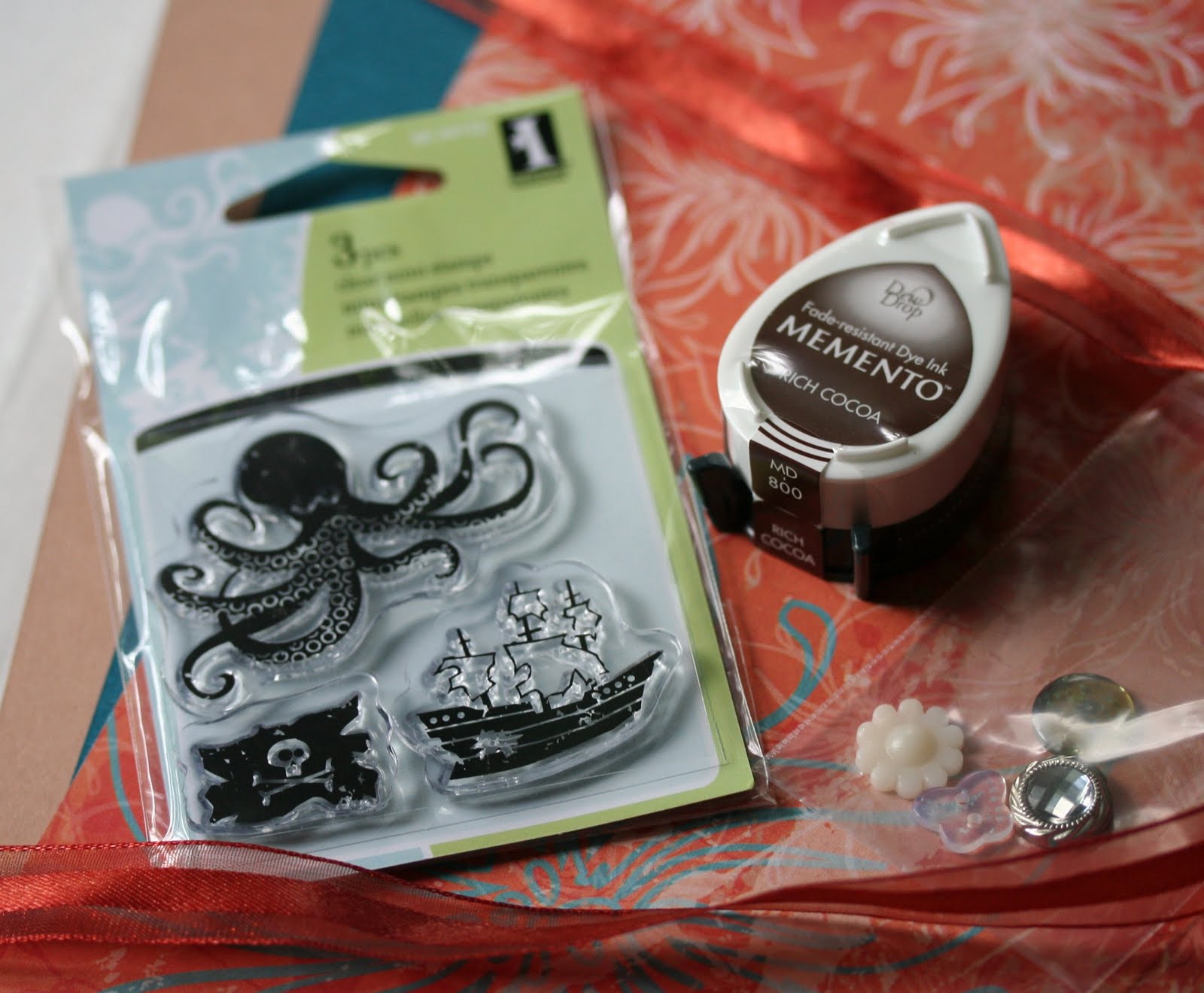 Anyway here are my two cards with the kit. I wanted to use a little bit of everything from the kit in one card. I knew I wanted to ink up the octopus so I decided to put him in a little ocean scene. The blue waves are the other side of the orange paper. I added some gel pen accents and added the ribbon to ground the sentiment.